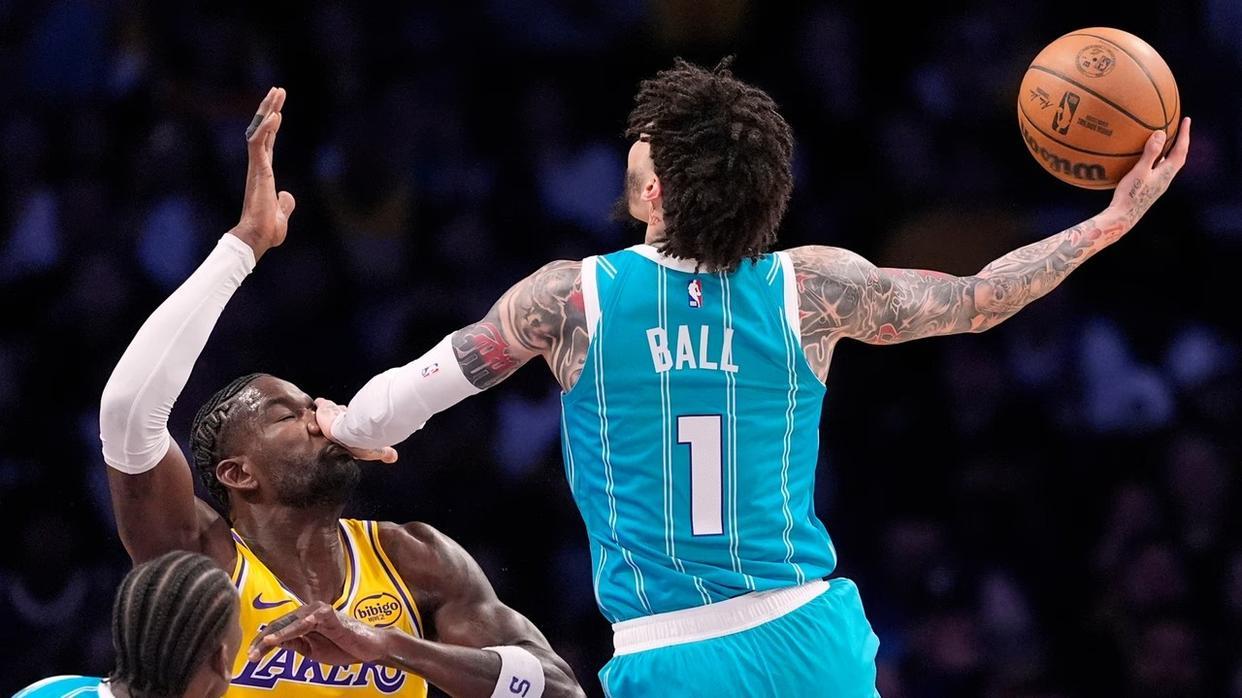 鲍尔、布里奇斯携手外线发难,黄蜂取得17分领先。东契奇与克尼佩尔在禁区斗法,鲍尔封盖拉拉维亚,文森特空位远投不进。詹姆斯上篮打进,夏洛特请求暂停。米勒跳投取分,范德比尔特补篮得手还以颜色,詹姆斯抢断鲍尔后打成了2+1。鲍尔、布里奇斯、米勒相继单打不中,詹姆斯低位跳投取分,分差仅为10分,湖人看到了逆转取胜的希望。
